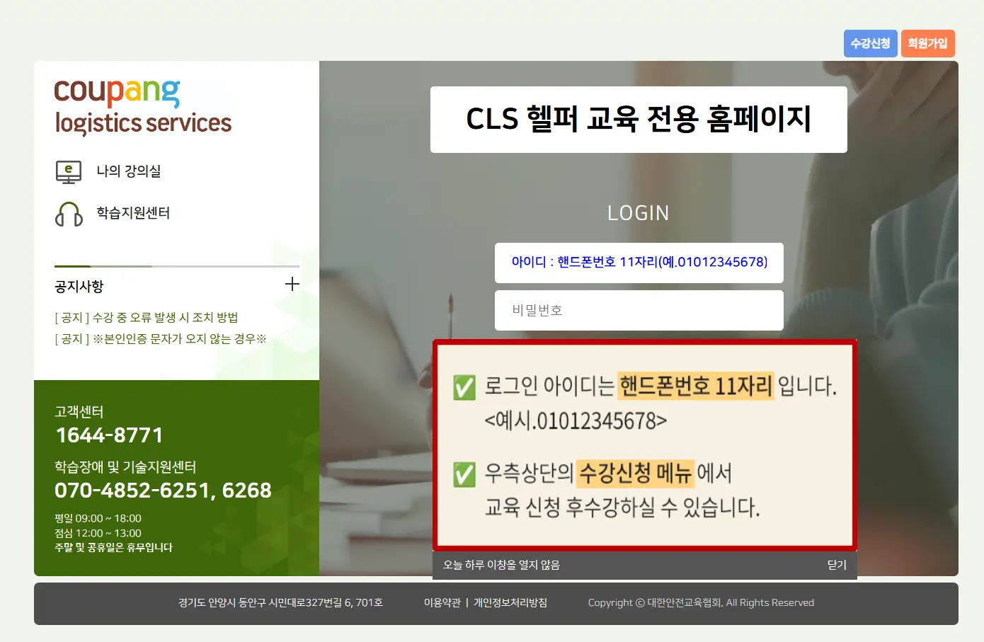 쿠팡로지스틱스서비스 알바(헬퍼) 안전교육 (clsdaily.esafetykorea.or.kr)