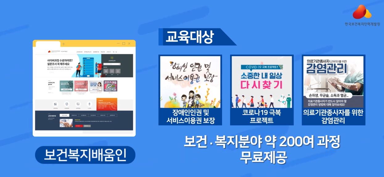 때문에 컴퓨터와 모바일에서 한국보건복지인력개발원 보건복지배움인을 통하여 원하는 사이버교육을 수강하시면 될 것 같습니다.