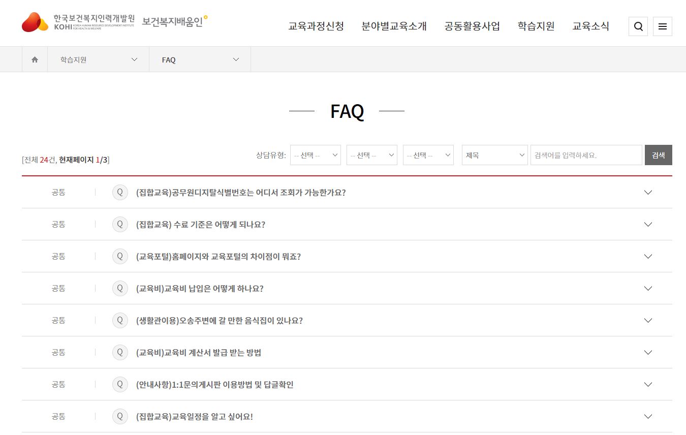 이런 KOHI 보건복지배움인 홈페이지 바로가기 (edu.kohi.or.kr) 에서는 교육과정신청 및 분야별 교육 소개 그리고 학습지원까지 제공을 하고 있습니다. 잘 모르는 부분은 FAQ를 통하여 확인이 되어지며, 원격지원까지 지원이 되어지고 있네요.
