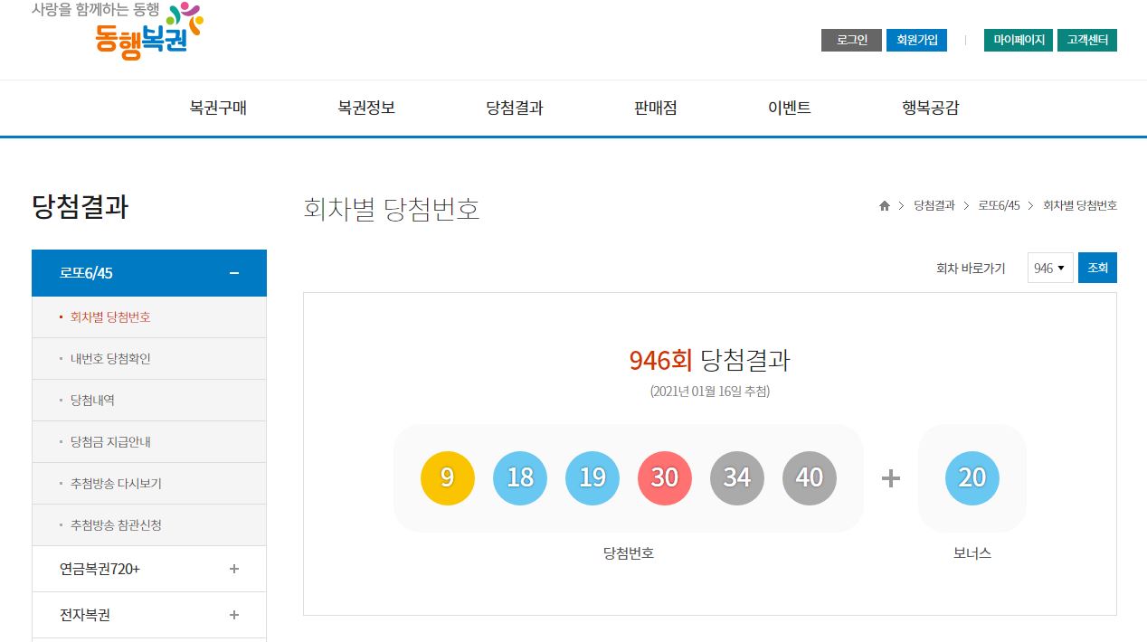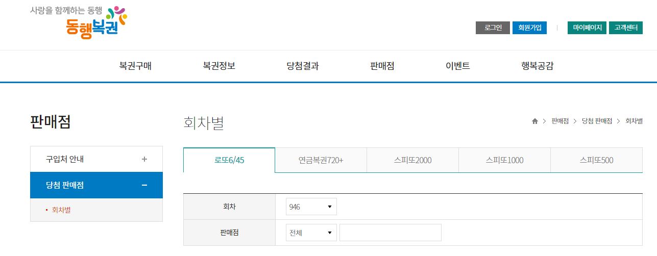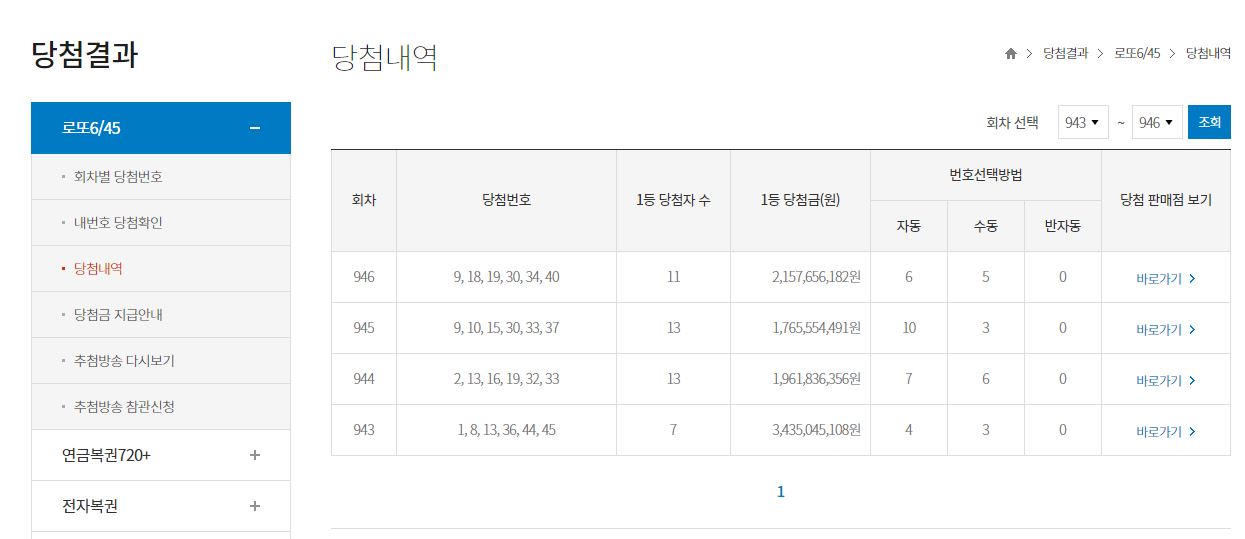 그 외에 동행복권에서는 회차 별로 당첨내역을 확인하실 수 있는데요. 덕분에 전체 로또 당첨 번호를 알 수 있습니다. 더불어 당첨된 판매점도 조회가 가능하여 명당자리 확인도 가능합니다.