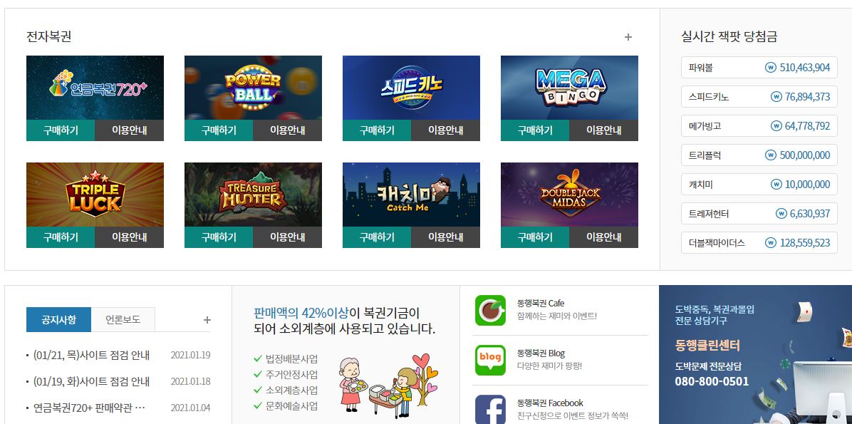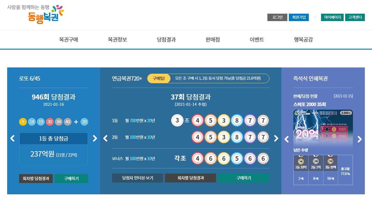 이렇게 오프라인으로 구매하지 않고 온라인을 이용하시려면 동행복권의 홈페이지를 통해서 구매를 하게 됩니다. 구매 뿐아니라 복권에 관련된 정보를 온라인을 통해서 제공하여 간편하게 볼 수 있는데요.