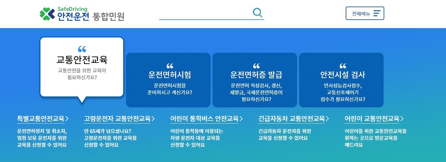 2019년부터 오픈을 한 도로교통공단의 안전운전 통합민원 홈페이지는 교통안전교육, 운전면허시험 운전면허 발급, 교통안전 전문교육, 강사 및 기능검정원, 교통안전시설 검사 등의 기능을 제공하고 있습니다.