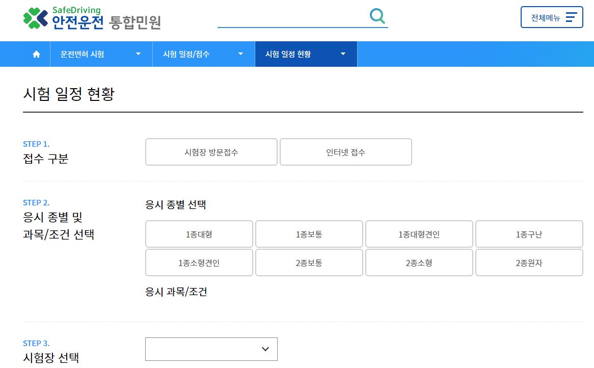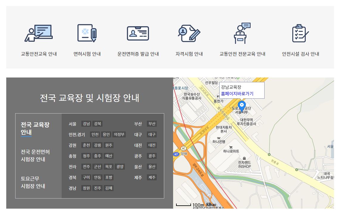 이 중에서도 운전면허를 준비하는 분들은 시험장의 접수를 이곳을 이용해서 하실 수가 있는데요. 전국의 교육장 및 시험장도 검색이 가능하기 때문에 이를 기반으로 찾아서 시험장도 선택을 하면 될 듯 싶습니다.