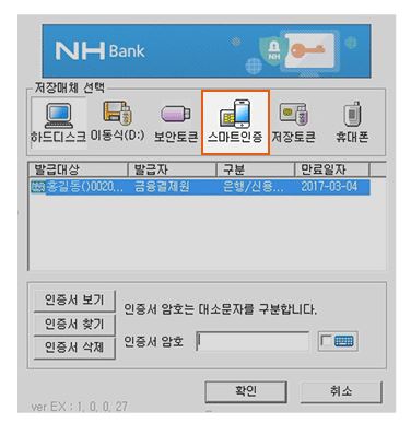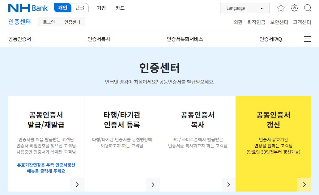 지금은 공동인증서를 발급 받아서 인터넷 뱅킹을 이용하는 형태입니다. NH Bank의 인증센터의 홈페이지를 통하여 접속을 하신 후에 발급/재발급, 등록, 복사, 갱신 등의 업무를 진행하실 수 있습니다.