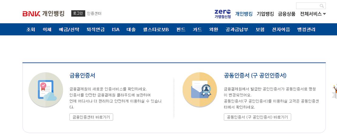 이러한 인증센터 같은 경우는 BNK 부산은행 인터넷뱅킹 홈페이지를 통하여 접근을 할 수가 있습니다. 과거에는 공인인증센터라고 불렸지만 현재는 공인인증서가 폐기가 된다고 하기에 그냥 인증센터라고 해서 서비스가 되어지고 있는 것 같습니다.