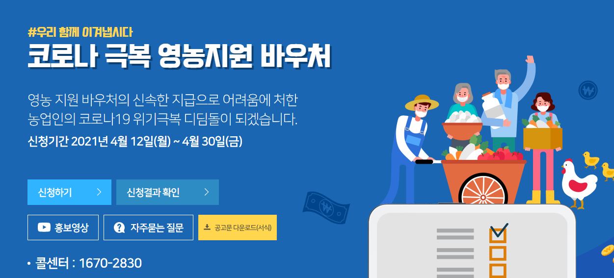 이외에 화훼/겨울수박/학교급식 납품을 비롯하여 친환경농산물/말 생산 그리고 농촌체험휴양마을 중 매출감소 농가는 농가지원바우처를 통해서 지원이 되어진다고 합니다. 코로나 극복 영농지원 바우처로써 4월 12일부터 30일까지 신청이 되어지구요.