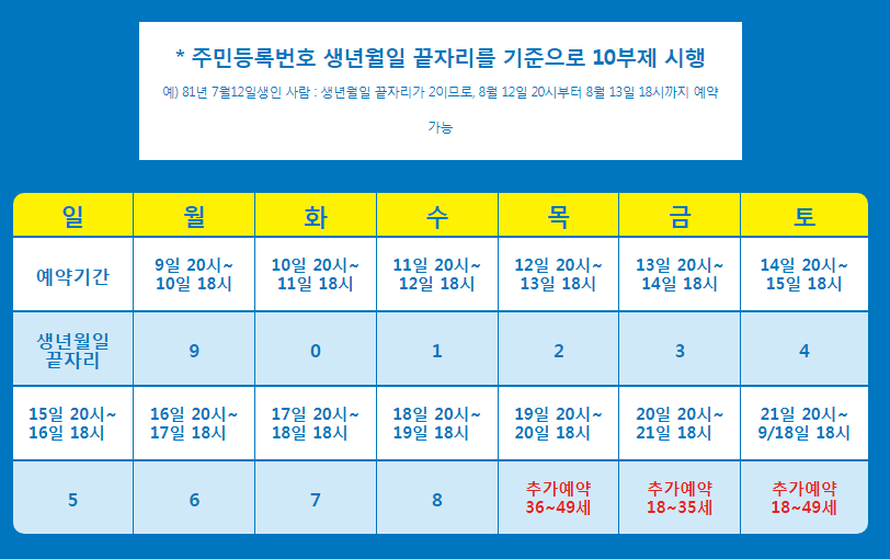 18~49세 코로나백신사전예약은 10부제로 19일 오후 6시까지 진행이 됩니다. 10부제는 생년월일 끝자리를 기준으로 하기 때문에 잘 확인해보시기 바랍니다.
