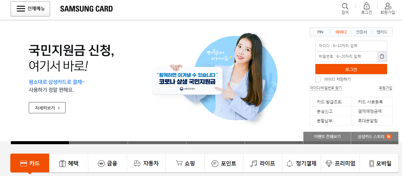 정부 국민지원금 역시 삼성카드로 신청이 가능하니 지원금 관련된 내용도 확인해보시면 좋을 것 같습니다. 그럼 삼성카드를 사용하시는 분들 홈페이지 바로가기 잘 활용하세요.