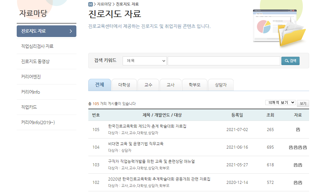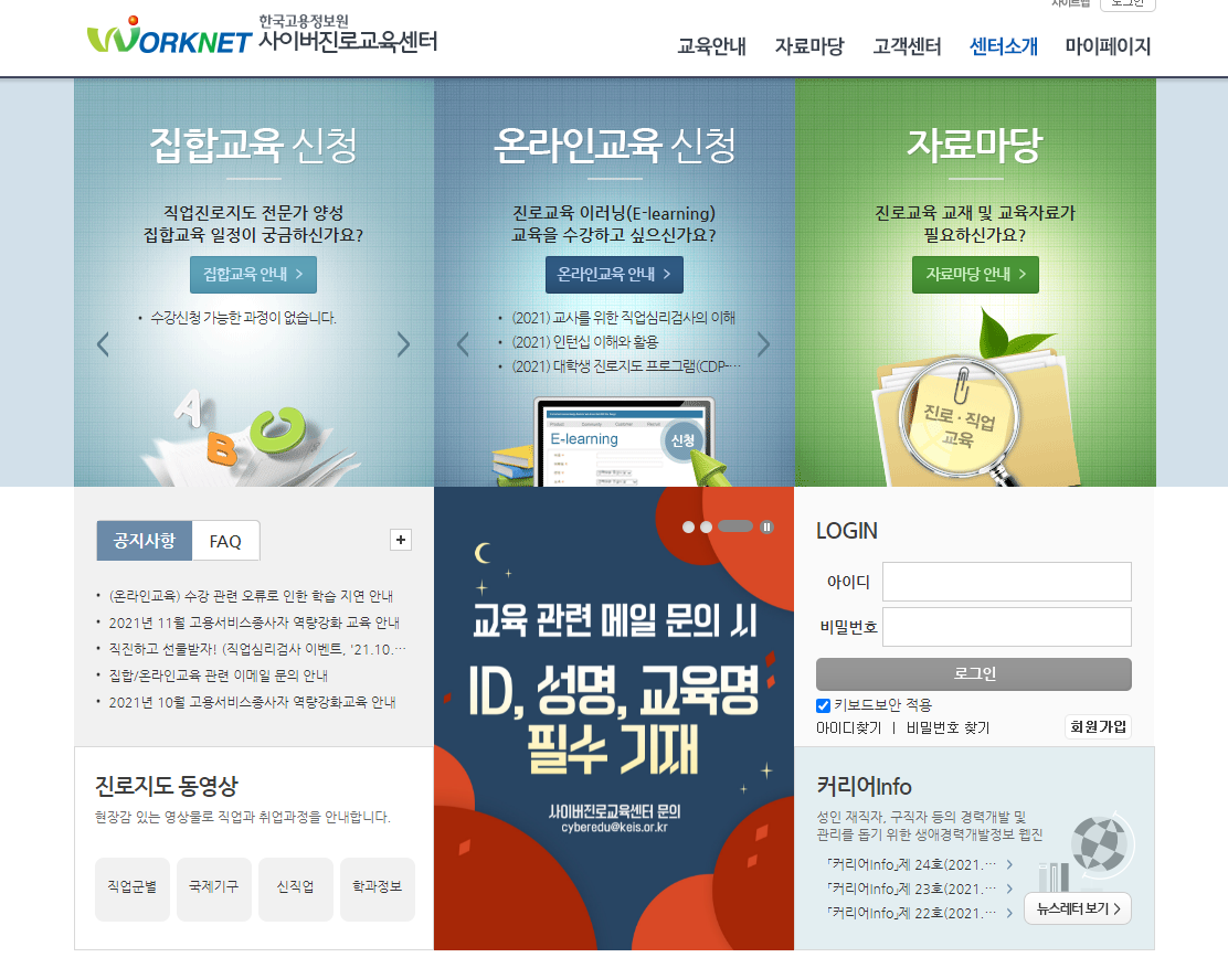 워크넷과 연결이 되어지는 한국고용정보원 사이버진로교육센터는 집합교육 신청, 온라인교육 신청이 진행이 되어지고 있습니다. 관련된 교육안내 및 자료마당 확인해보시고 사이버진로교육센터 잘 이용해보세요.