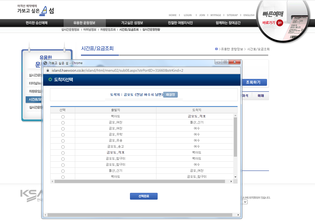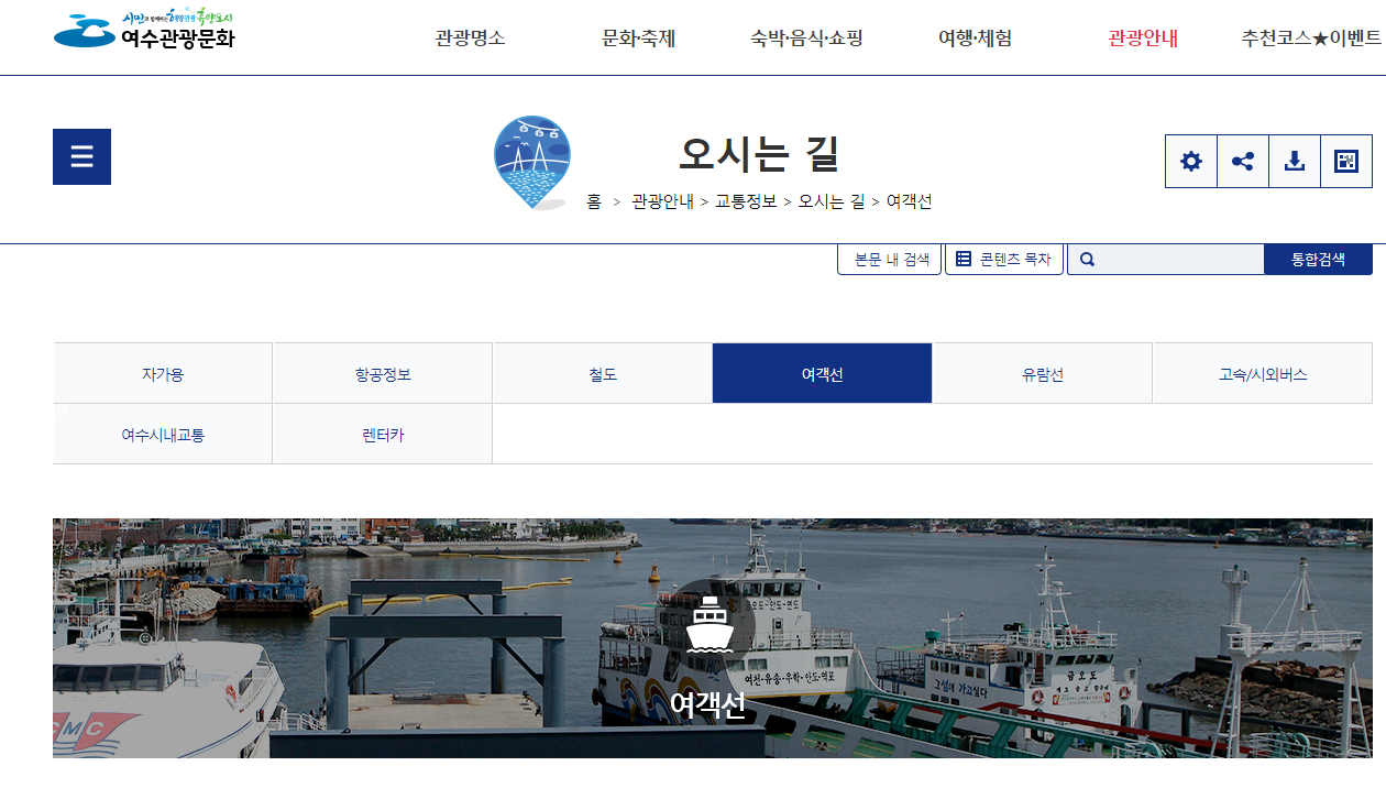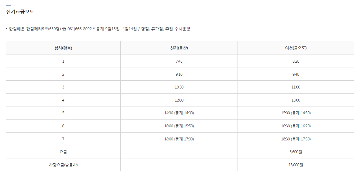 금오도 배시간표는 여수관광분화의 오시는 길 > 여객선을 통하여 확인하시면 온라인으로 쉽게 보실 수 있습니다.