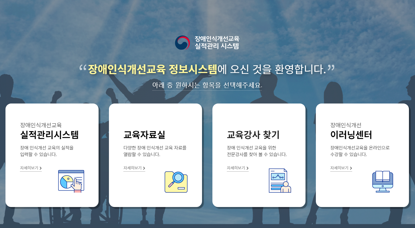 장애 인식개선 교육의 실적을 입력할 수 잇는 실적관리시스템을 제공하는 홈페이지가 온라인으로 운영되어집니다. 온라인 홈페이지에서는 장애인식개선교육 실적관리시스템 뿐아니라 교육자료실, 교육강사 찾기, 장애인식개선 이러닝센터도 확인됩니다.
