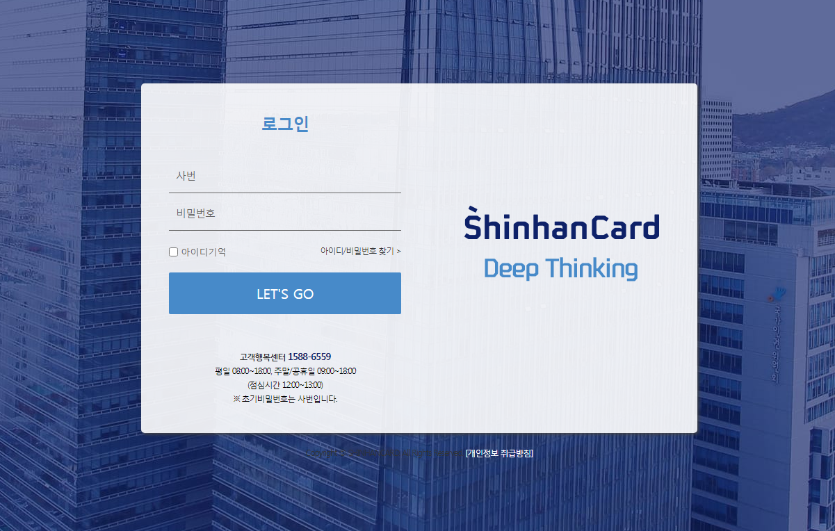 신한카드의 임직원들이 이용하는 온라인 강의 수강 홈페이지로써 사이버연수원이 있습니다. 사번을 통하여 로그인을 하시고 연수원에 있는 교육과정 확인하고 수강하시면 될 것 같습니다.
