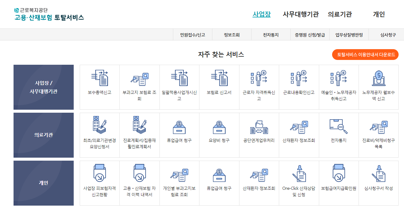 떄문에 많은 사업장에서 토탈서비스를 이용하여 업무를 인터넷으로 쉽게 처리를 한다고 합니다. 아무래도 직접 공단에 방문을 하는 것은 부담스럽기 때문에 잘 구축한 서비스인 것 같습니다.