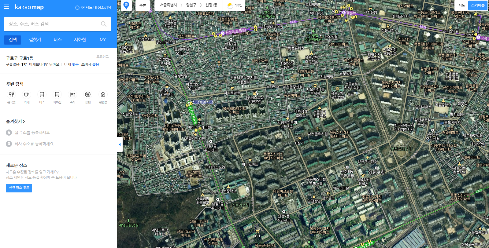 다음지도에서 상단 메뉴를 확인하시면 스카이뷰 아이콘이 보이구요. 이를 통하여 지도에서 하늘을 내려다보는 듯한 뷰를 확인하실 수 있습니다. 이 상태에서 원하는 장소를 찾으시면 되겠죠?