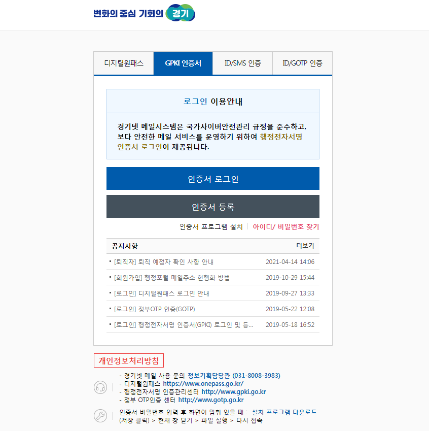 경기넷 메일시스템은 보안을 위하여 디지털원패스, GPKI 인증서, ID/SMS인증, ID/GOTP 인증으로 로그인하시고 사용할 수 있다고 합니다. 따라서 적합한 절차를 통하여 접속하고 안전하게 경기넷 메일 사용하시길 바랍니다.