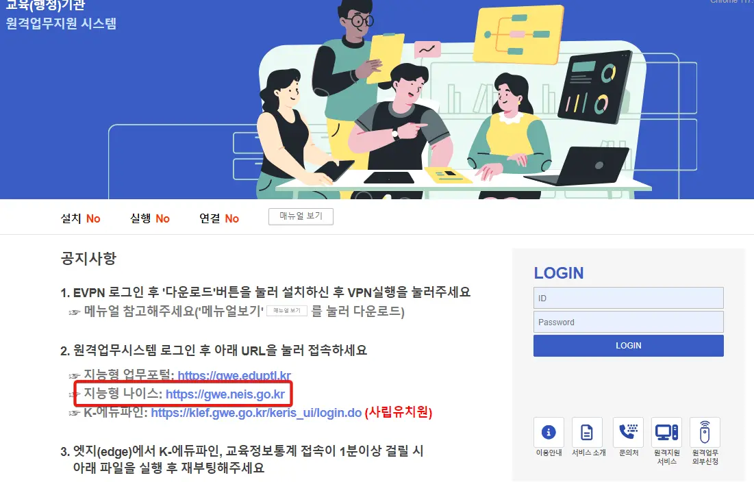 강원도교육청 EVPN에 접근하시면 로그인이 가능하고 이후에 VPN설치 후에 실행, 연결을 진행하셔야 합니다. 그러면 지능형 나이스(NEIS)에 접속이 됩니다.