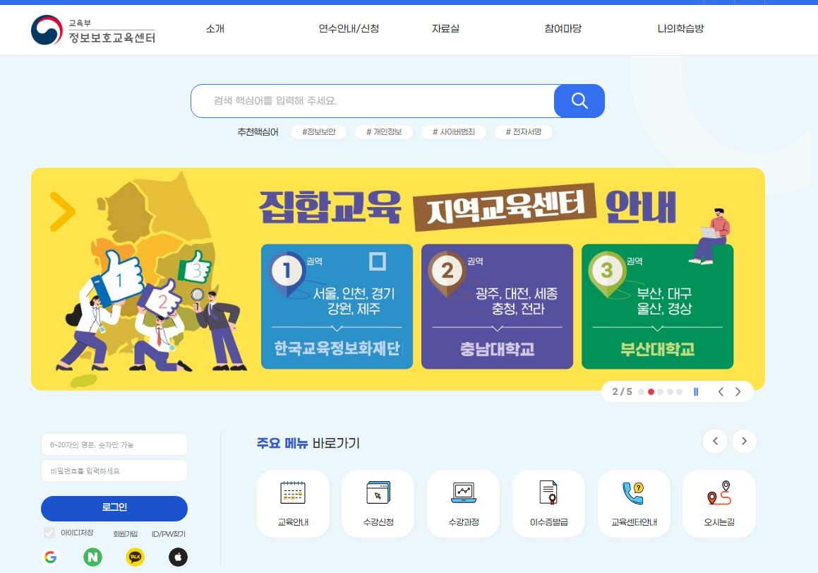 정보보호교육센터에서는 교육기관의 정보보호 역량 강화를 위한 교육과정을 진행하고 있습니다. 이런 교육은 정보보보교육센터 사이버교육으로 진행이 되어지니 원격과정 대상자 분들은 교육안내 확인하시고 수강 신청 진행해보시기 바랍니다.