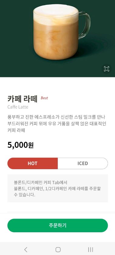 현재 물가가 전세계적으로 많이 오르고 있는 상황이라서 이보다도 비싸질지도 모르겠는데요. 커피와 밀크의 조화로 만들어지는 부드러운 맛을 가지고 있는 카페라떼 역시 가격이 변동될 수도 있을 것 같습니다. 아무튼 현재로써는 스타벅스 카페라떼 tall 사이즈의 가격은 5,000원으로 이는 hot과 ice모두 같다는 점이 확인되었습니다.