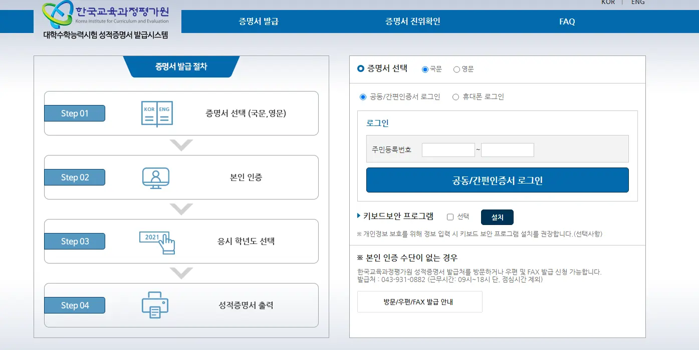 증명서 선택 국문 영문 본인 인증 수단이 없는 경우 한국교육과정평가원 성적증명서 발급처를 방문하거나 우편 및 FAX 발급 신청 가능합니다. 발급처 : 043-931-0882 (근무시간: 09시~18시 단,