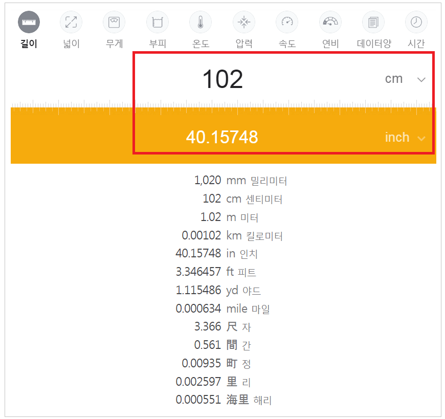 따라서 허리둘레 102cm를 인치로 환산하게 되면 다음과 같이 나오게 됩니다.