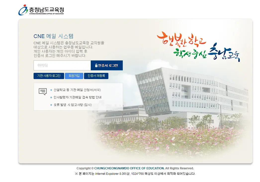 CNE 메일 시스템은 충청남도교육청 교직원을대상으로 사용하는 업무용 메일입니다.개인 사용자는 개인 아이디 입력 후인증서 로그인 해주시기 바랍니다.