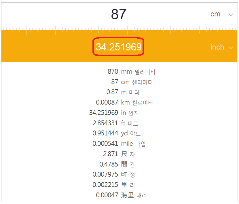 센치미터에서 인치로의 변환 방법 (허리둘레 87cm는?)