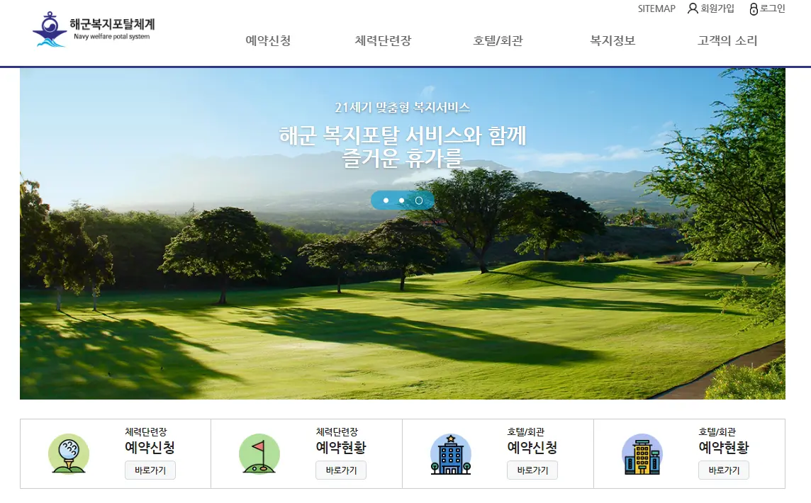 특히 체력단련장은 많은 분들이 이용하는 골프시설이 제공되어집니다. 시설, 요금, 교통 등을 웹사이트로 쉽게 확인이 되어지니 확인 후 예약을 진행하시면 됩니다. 이런 해군복지시설예약체계는 회원가입 후 로그인을 하셔야 이용이 가능하다는 점은 명심하시기 바랍니다. 그럼 온라인 서비스를 통하여 해군복지시설 예약을 간편하게 진행해보시기 바랍니다.