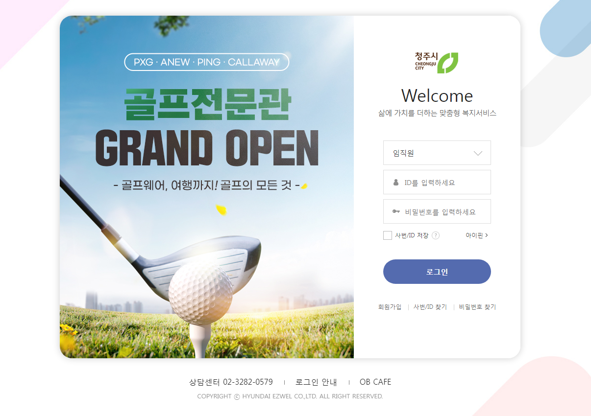 청주시청 직원을 위한 맞춤형 후생복지관 웹사이트에 접속을 해보시면 임직원분들이 로그인할 수 있는 페이지가 확인됩니다. 인증된 직원분들은 자신의 ID와 비밀번호를 통하여 로그인하여 이지웰 복지관에 들어갈 수 있습니다.