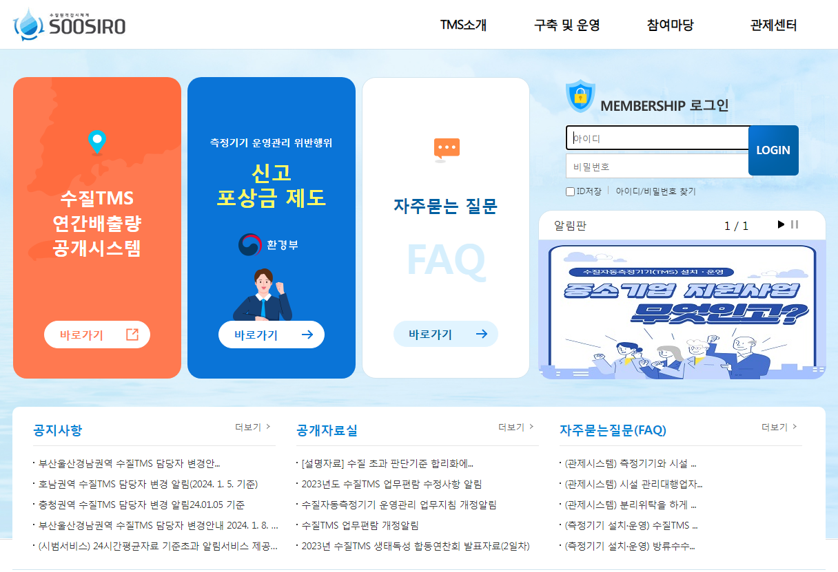 웹페이지에서는 측정기기 설치 및 운영, 측정기 운영관리, 위반행위 신고 포상금 제도 등이 관리되어진다고 합니다. 더불어 수실TMS 연간배출량도 확인이 된다고 합니다.