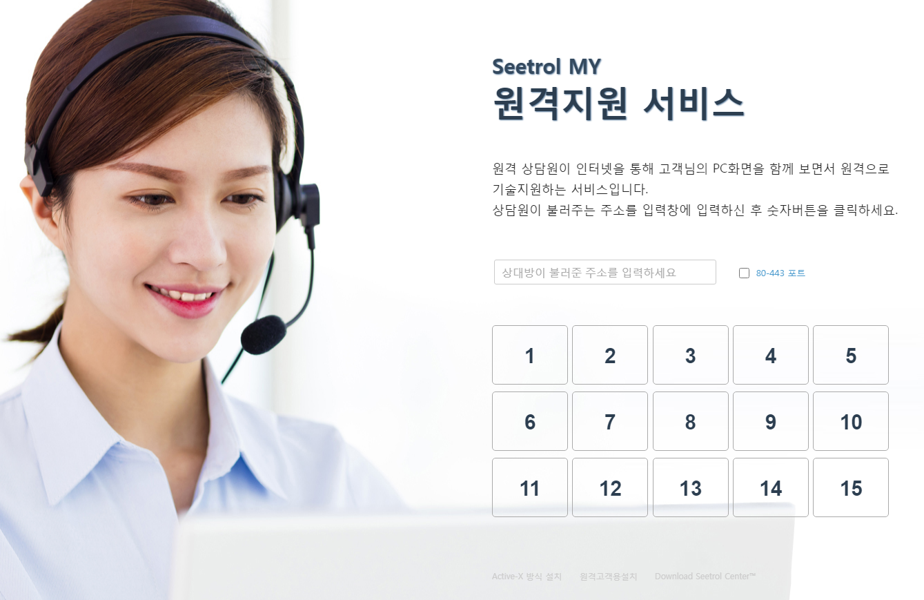 Seetrol MY 원격지원 서비스 원격 상담원이 인터넷을 통해 고객님의 PC화면을 함께 보면서 원격으로 기술지원하는 서비스입니다. 상담원이 불러주는 주소를 입력창에 입력하신 후 숫자버튼을 클릭
