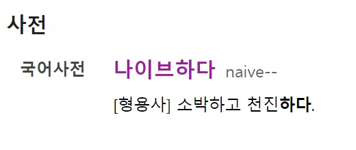 나이브하다는 'naive'가 우리나라 말처럼 사용되는 것입니다. naive는 소박하고 천진하다라는 의미를 가지고 있는데요. 이는 '순진한', '천진난만한', '경험 부족으로 세상 물정을 모르는' 등의 의미를 가지고 있습니다.