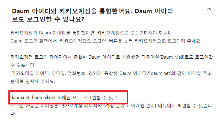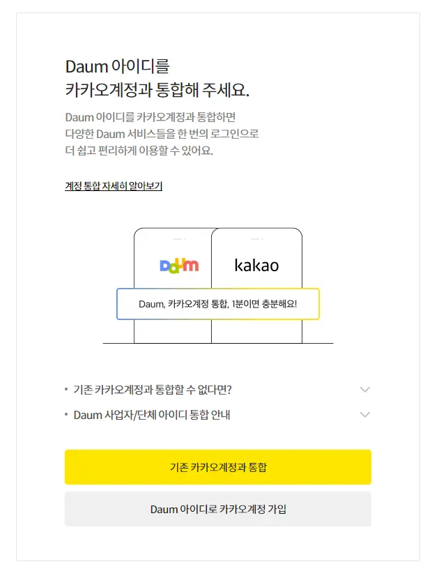 기본적으로 이제는 다음메일, 한메일을 사용하기 위해서는 카카오계정으로 통합이 우선적으로 진행되야 합니다. 기존에 한메일만 이용하던 분들도 이제는 통합과정을 거치셔야 한다고 하네요.