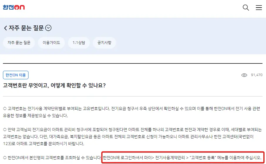 - 한전 ON 홈페이지 이용 : 홈페이지에 로그인하여 마이 > 전기사용계약관리 > 고객번호 등록 메뉴를 이용할 수 있습니다.
