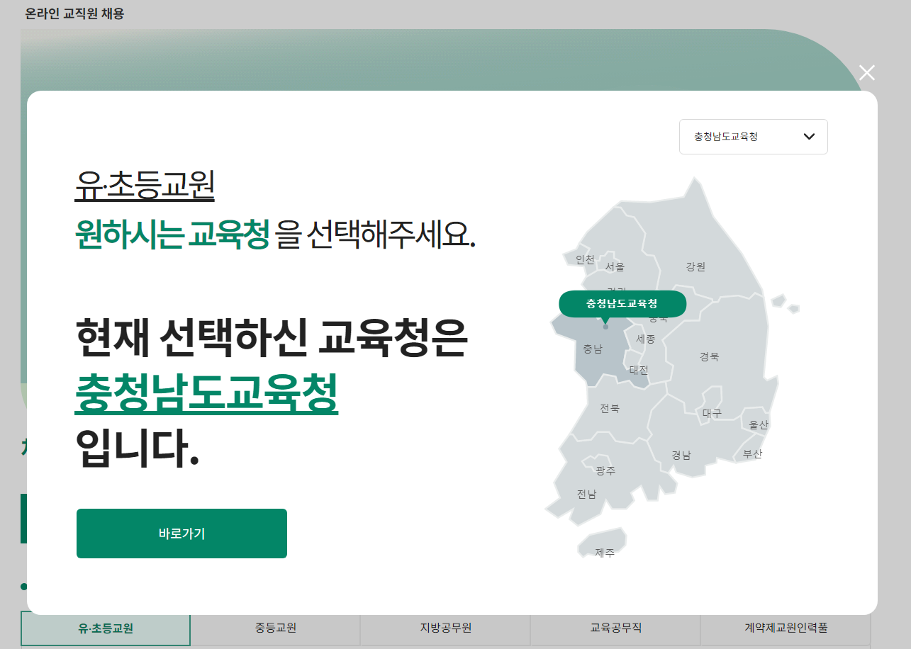 예를 들어 유치원 초등교원을 채용분야로 선택하시면 지역별 교육청들이 확인되어집니다. 여기에서 충청남도교육청을 택하면 관련된 온라인 채용시스템이 확인됩니다.