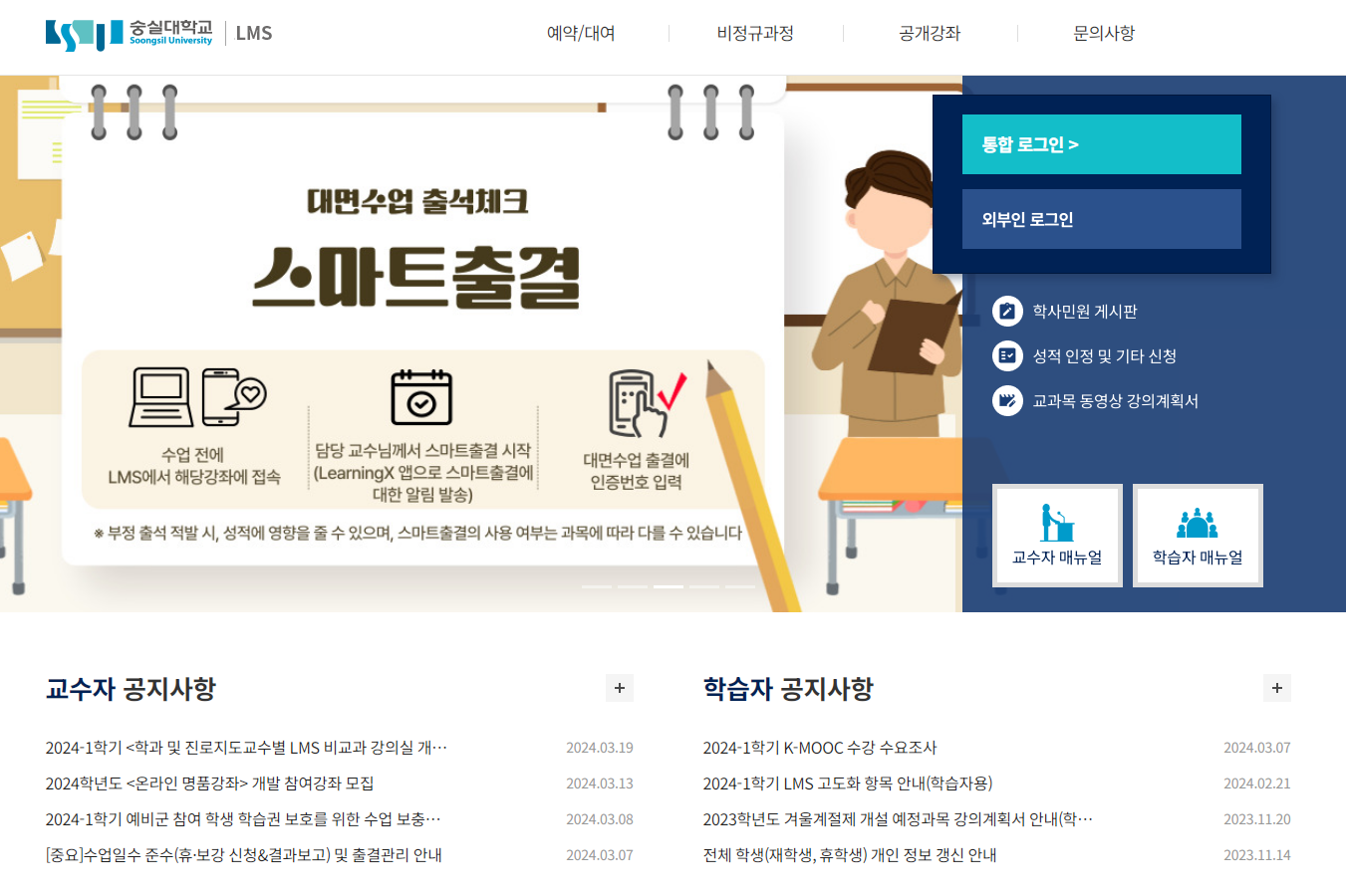 숭실대학교에서는 학생들이 온라인으로 강의를 듣고 과제를 제출할 수 있는 LMS를 제공합니다. 이런 숭실대학교 LMS에서는 학사민원 게시판, 교과목 동영상 강의계획서, 교수자/학습자 매뉴얼 등을 확인하실 수 있습니다.