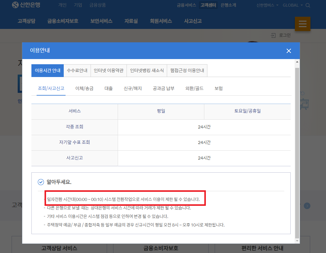 신한은행 인터넷뱅킹 홈페이지에서는 고객센터를 통해 이용시간을 확인하실 수 있습니다. 이곳에서는 신한은행 인터넷뱅킹은 일자전환 시간대 (00:00 ~ 00:10) 일 때 시스템 전환작업으로 서비스 이용이 제한 될 수 있다고 합니다. 따라서 신한은행 점검시간은 이때가 해당 됩니다.