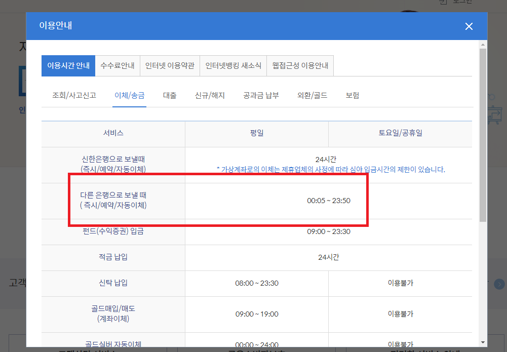 이외에도 서비스에 따라서 이용이간이 다르기도 하는데요. 예를 들어 많이 이용하시는 다른 은행으로 보낼때는 00:05 ~ 23:50이 이용시간입니다. 때문에 이런 경우 점검시간을 오후 11시 50분에서 다음날 12시 5분이라고 생각하실 수도 있을 것 같습니다.