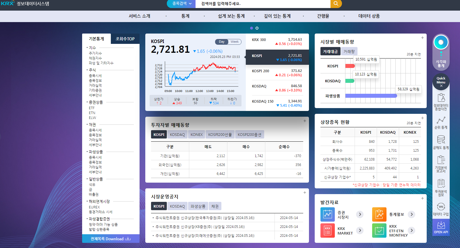증권·파생상품의 시장정보(Marketdata), 공매도정보, 투자분석정보(SMILE) 등 한국거래소의 정보데이터를 통합하여 제공 서비스