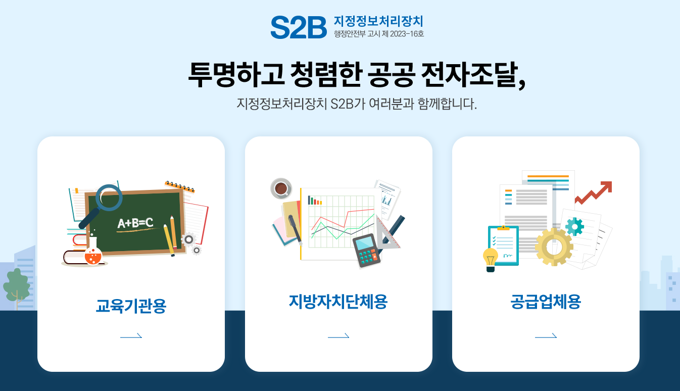 S2B에서는 투명하고 청렴한 공공 전자조달을 위하여 교육기관용, 지방자치단체용, 공급업체용 전자조달시스템을 제공하고 있습니다.