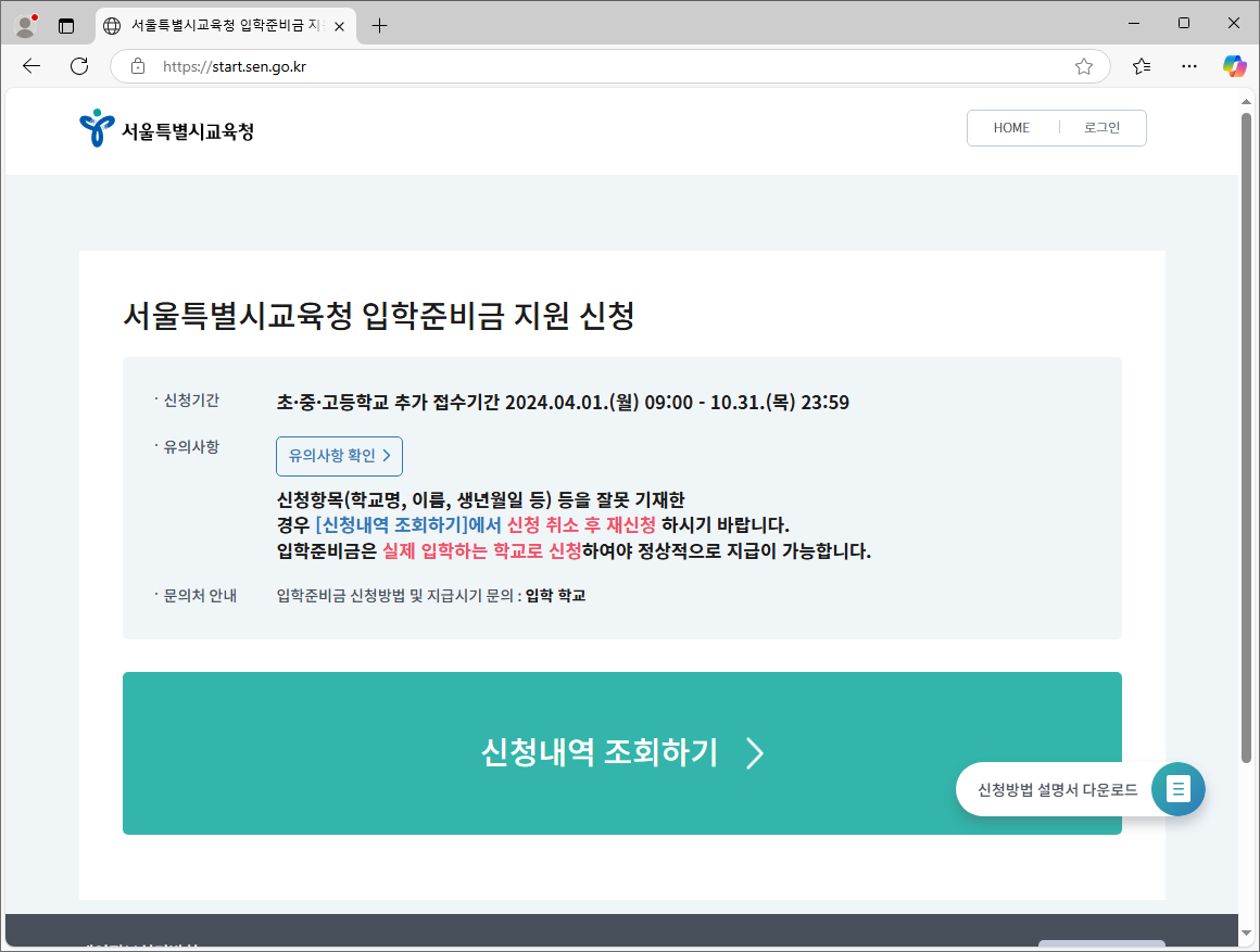 - 신청 사이트: 서울특별시교육청 입학준비금 신청 시스템