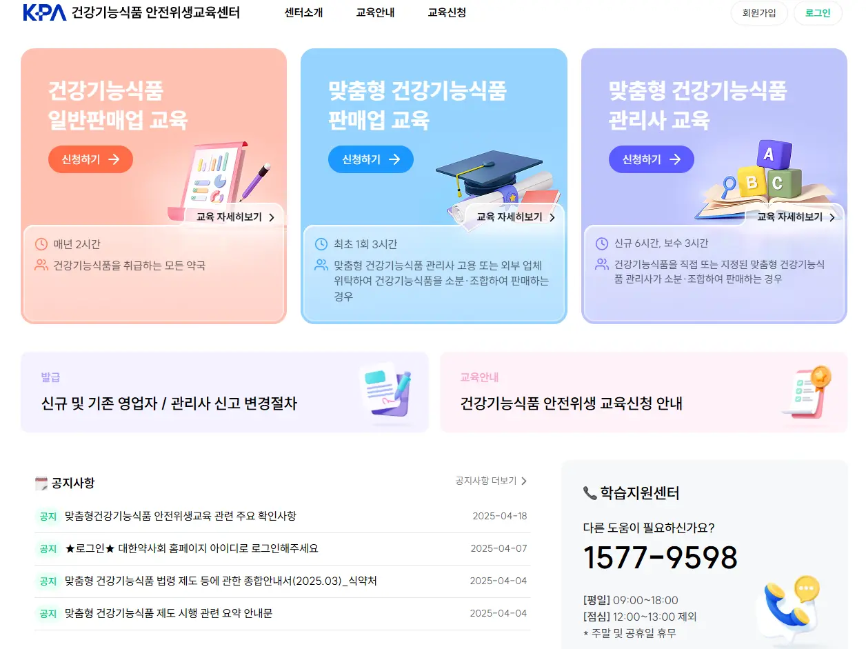 대한약사회 건강기능식품 안전위생교육센터 웹사이트를 통해 교육 신청 및 수강이 가능합니다.